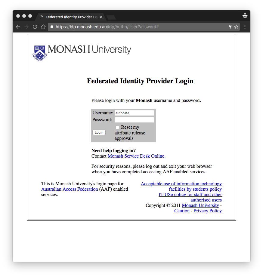 You will be presented with the login form for the selected organisation. Enter your authentication credentials for your organisation. The image below demonstrates the Monash University login service.