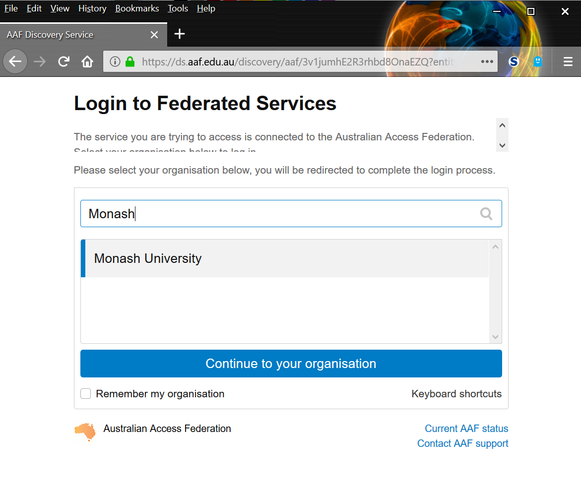 Type in 'Monash' or scroll through the list to 'Monash University' and then click on the text to select it. Once that is done, click on 'Continue to your organisation'.