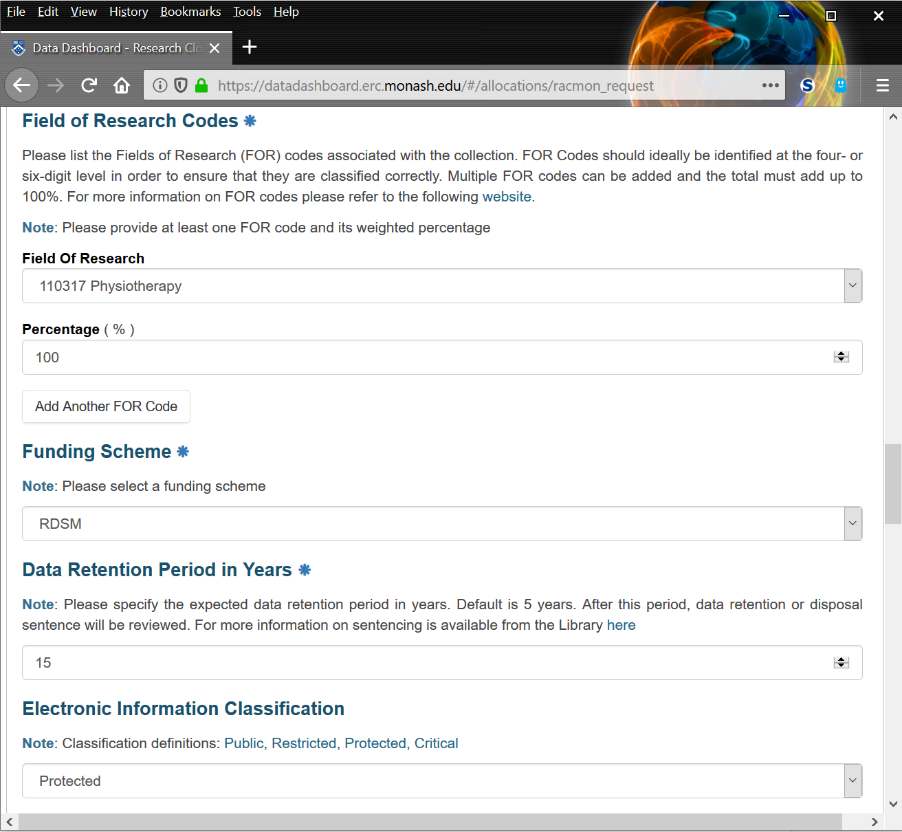 The remaining subsections in Section 2 relate to Field of Research Codes (FOR), funding, data retention and security classification. The relevant FOR code(s) should be entered by scrolling through the dropdown list or by typing the number when the dropdown list is open. Using the correct FOR codes will ensure that the data is classified correctly and is useful for reporting purposes. Once the code(s) have been added, the relevant percentage(s) should be checked to ensure that they add up to 100%. The Funding Scheme dropdown list will display 'RDSM' by default and should be used unless another funding scheme has been discussed with you. The Data Retention Period in Years textbox should be used to enter the number of years that the allocation data needs to be retained. The standard retention period for most research data is five years, but some data may need to be retained for longer periods, or indefinitely, depending upon the type of data and/or the relevant ethics agreement or contract with a third-party. If you are not sure, you can leave the default value of '0' and a member of the RDS team will contact you and identify the appropriate retention period. Please note that data will NOT be deleted at the end of the specified retention period, but you will be contacted in order to discuss the data and how it should be managed (published, archived, etc). The next subsection, Electronic Information Classification, relates to the security and sensitivity of the data. If the data contains, for example, personally-identifiable patient data then it is considered 'Critical' data. If the data is private and should be only be accessed by specific Monash staff, then 'Restricted' is the best option and is used in most cases. If you are unsure, the question can be ignored as it is not mandatory. The final subsection, Research Grant Information, is optional and can be used to include information about the grant(s) funding the project that is being undertaken and that will store data in the requested allocation.