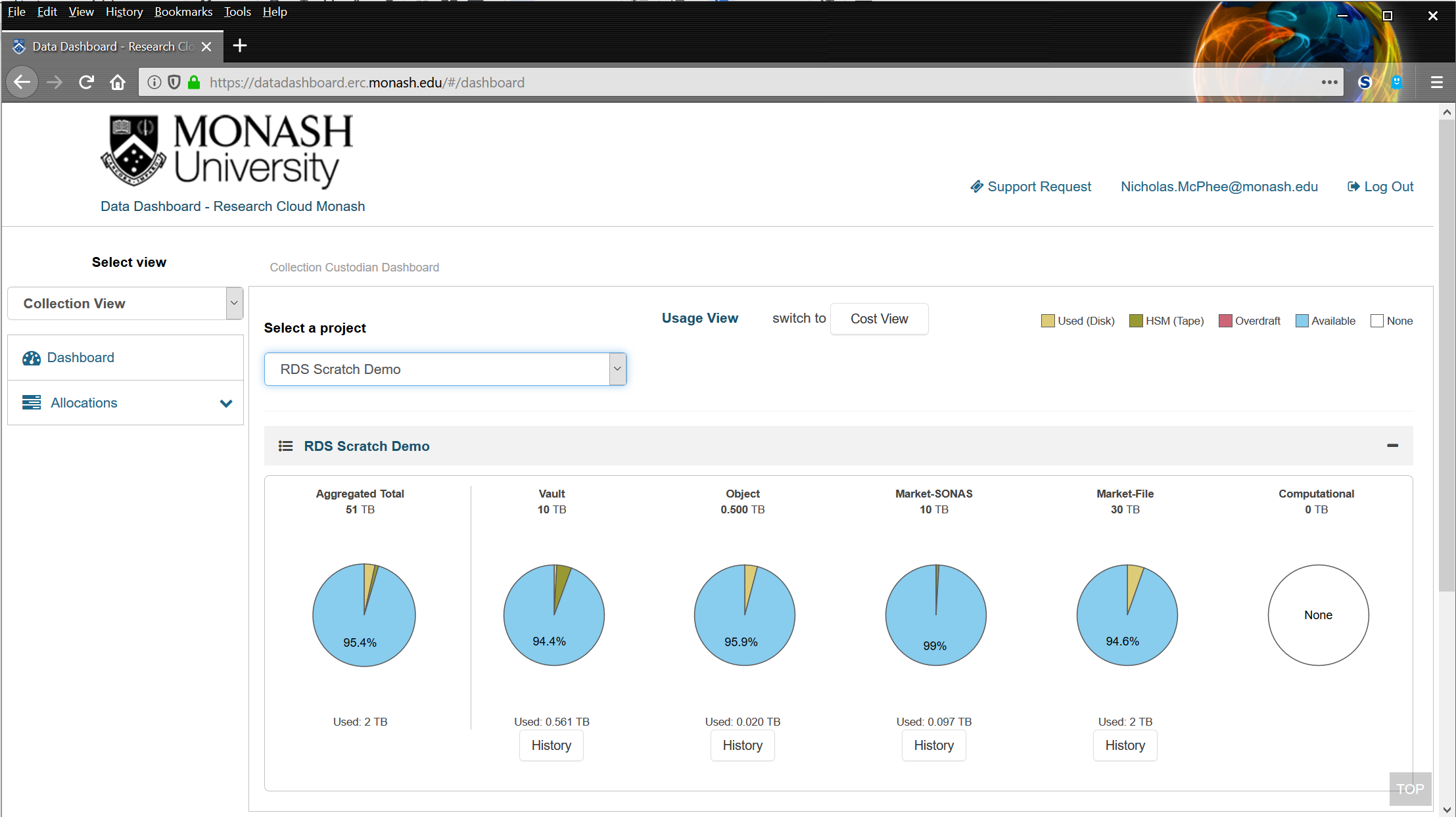The Data Dashboard is a web-based interface that allows researchers to apply for storage on Monash University's research data storage infrastructure, request extensions if more space is required and monitor their usage. New storage applications are lodged as requests which are then submitted, approved and provisioned before being made available for use. Each request is referred to as a 'storage allocation' and each allocation has a quota that can be increased if required (subject to approval). Most allocations are lodged to support the storage needs of a specific research project or research group, but allocations for individual research can also be requested.
