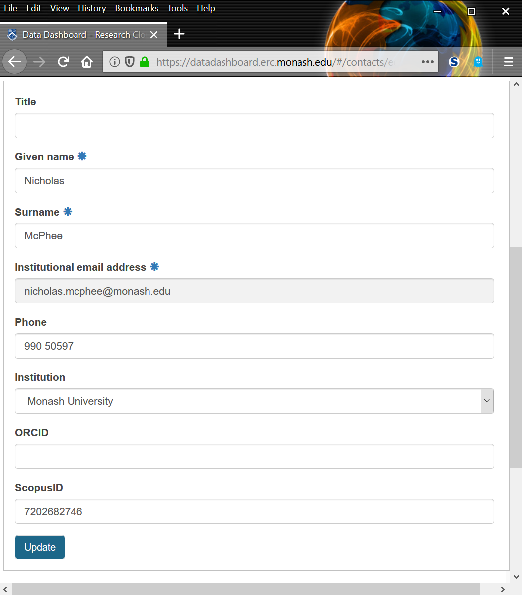 You can update your personal details by clicking on your email address which is located in the top right-hand corner of the page. This will open a new page which may take a few moments to load depending upon how many allocations list you as a Data Custodian or Technical Contact. The top section contains elements such your title, name, email address and phone number. Clicking on the 'Update' button will allow you to update your details, with the exception of your email address which is immutable. Clicking on 'Update' once again will save any changes you have made.