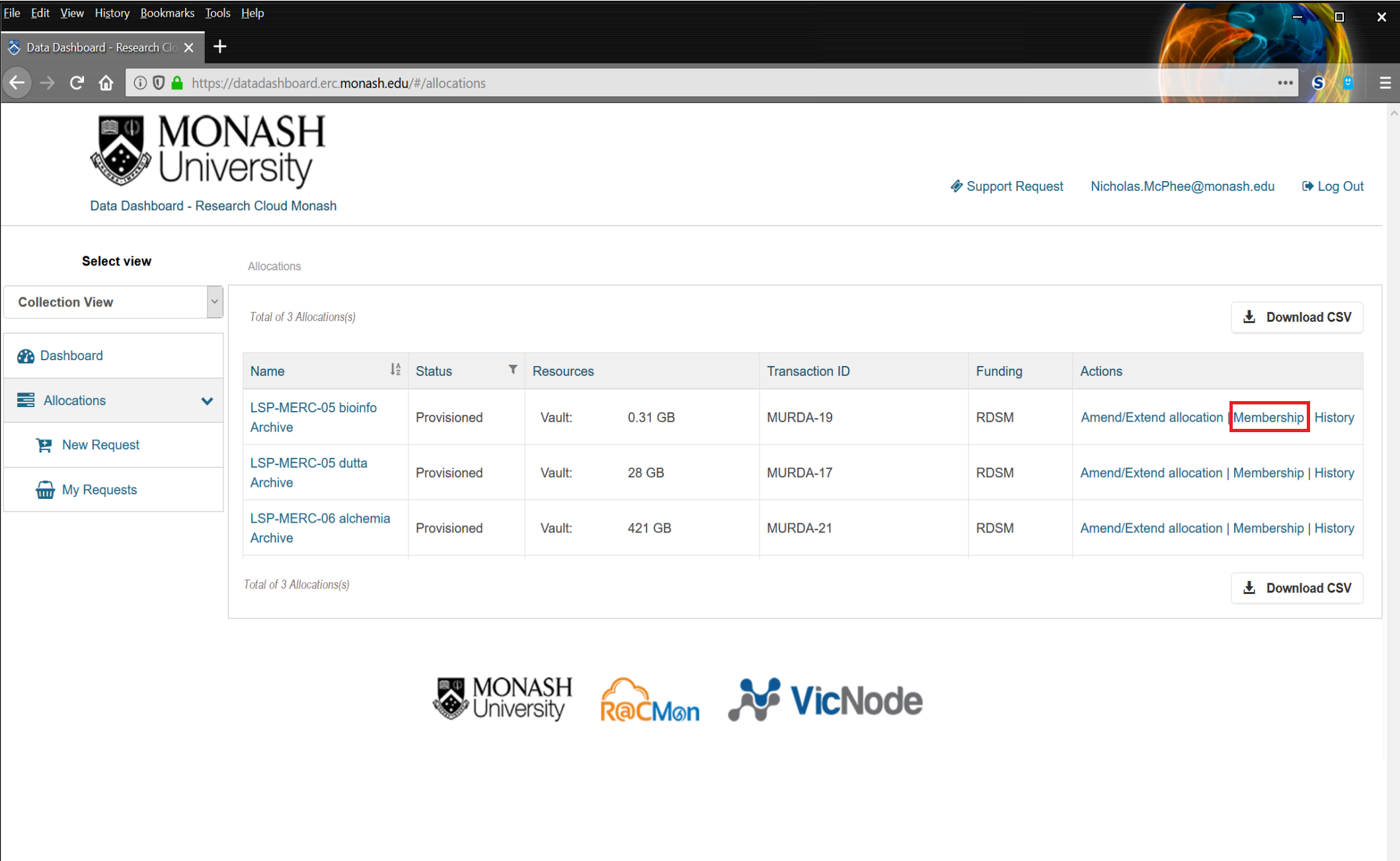 If you have already authenticated using Okta, for example by logging into the My.Monash portal, you will be logged in automatically. Otherwise, enter your Monash username and password and then click on 'Log in'. From the home page of the Dashboard, click on the 'Allocations' button in the left menu and then click on 'New Request'.