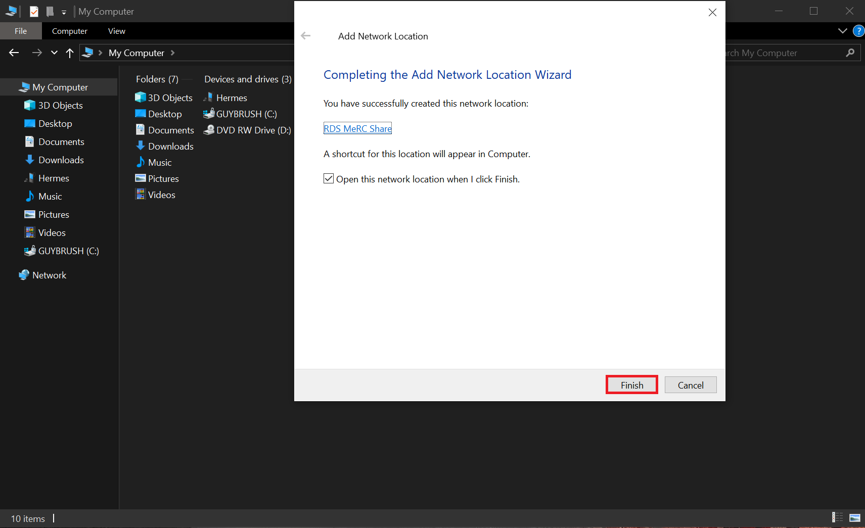 - The newly-mapped share will then appear as a folder in the Windows Explorer.