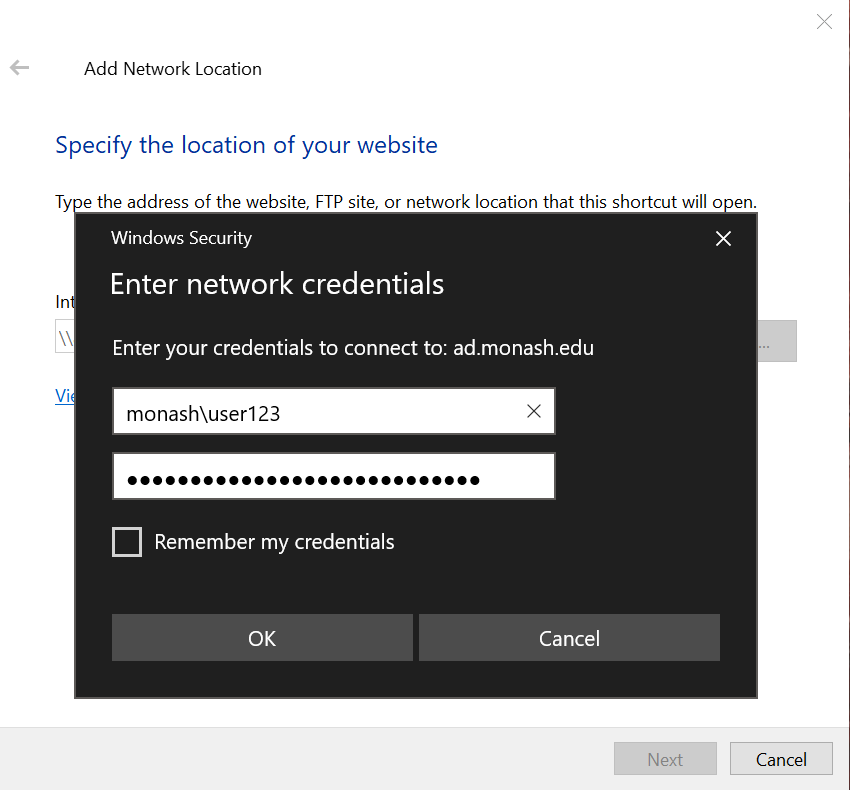 MONASH\" to your Monash username (e.g.MONASH\user123).